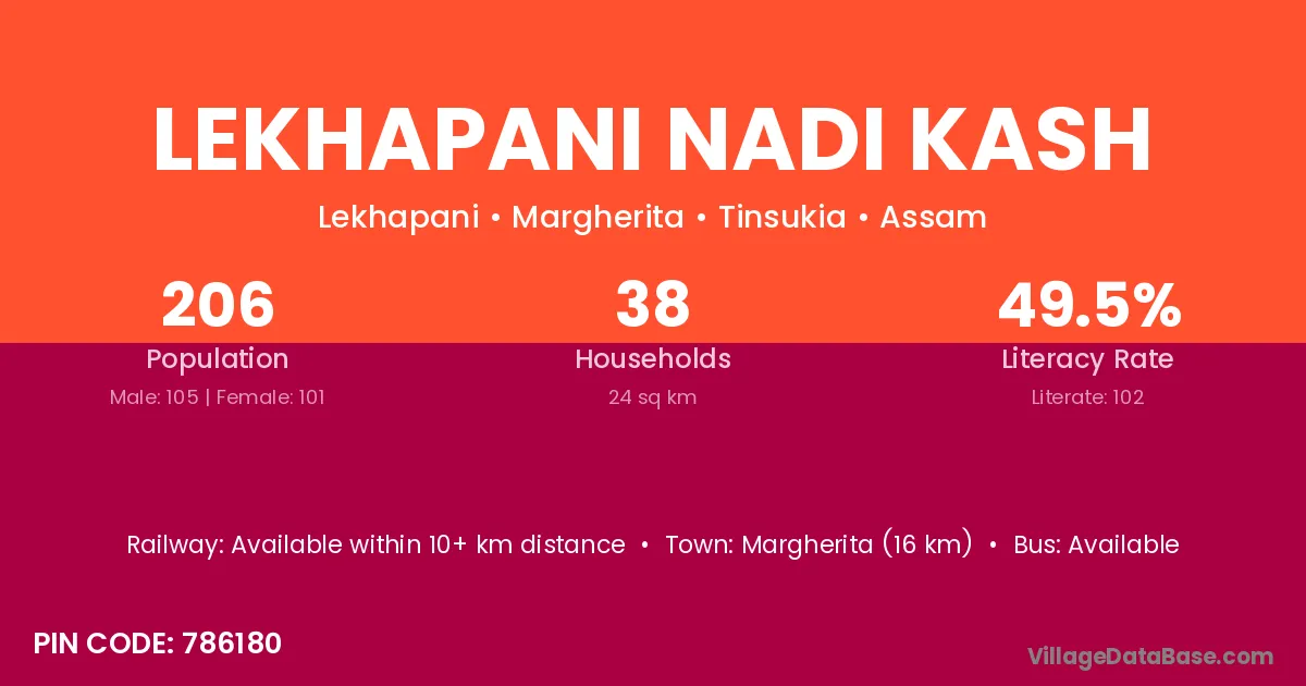 Margherita (16 km) is the nearest town to Lekhapani Nadi Kash village for major economic activities and is located approximately 16 km away.