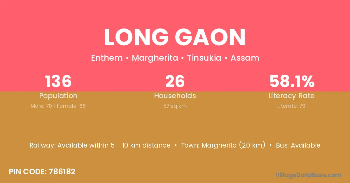 Margherita (20 km) is the nearest town to Long Gaon village for major economic activities and is located approximately 20 km away.