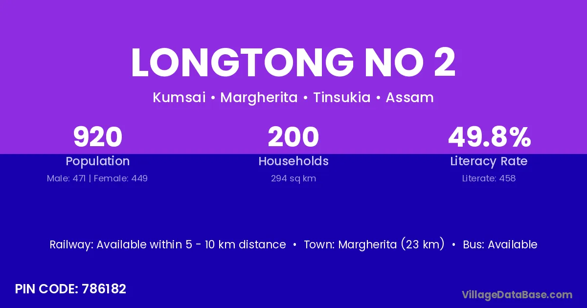 Margherita (23 km) is the nearest town to Longtong No 2 village for major economic activities and is located approximately 23 km away.