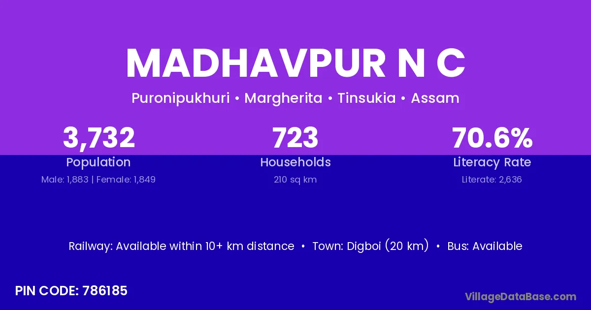 Digboi (20 km) is the nearest town to Madhavpur N C village for major economic activities and is located approximately 20 km away.
