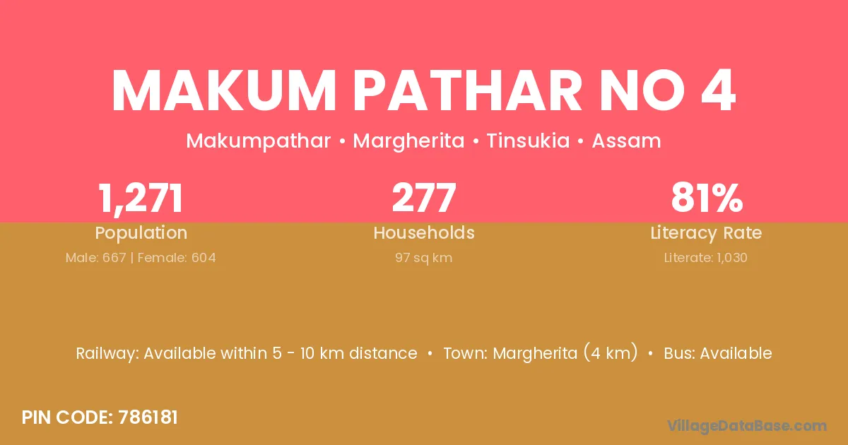 Margherita (4 km) is the nearest town to Makum Pathar No 4 village for major economic activities and is located approximately 4 km away.