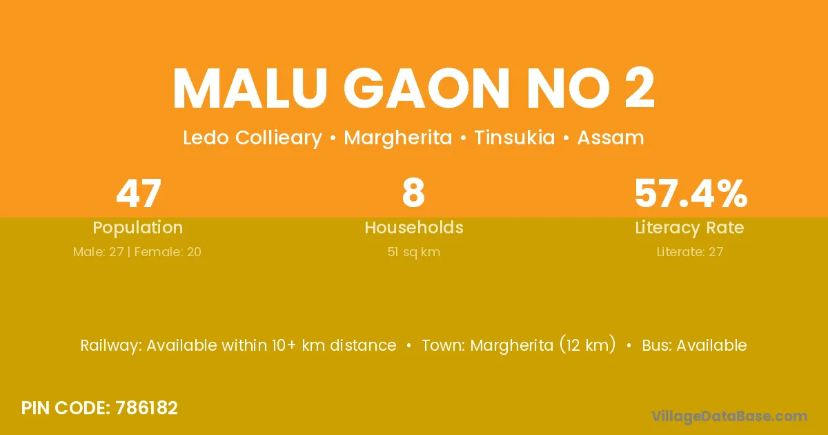 Margherita (12 km) is the nearest town to Malu Gaon No 2 village for major economic activities and is located approximately 12 km away.