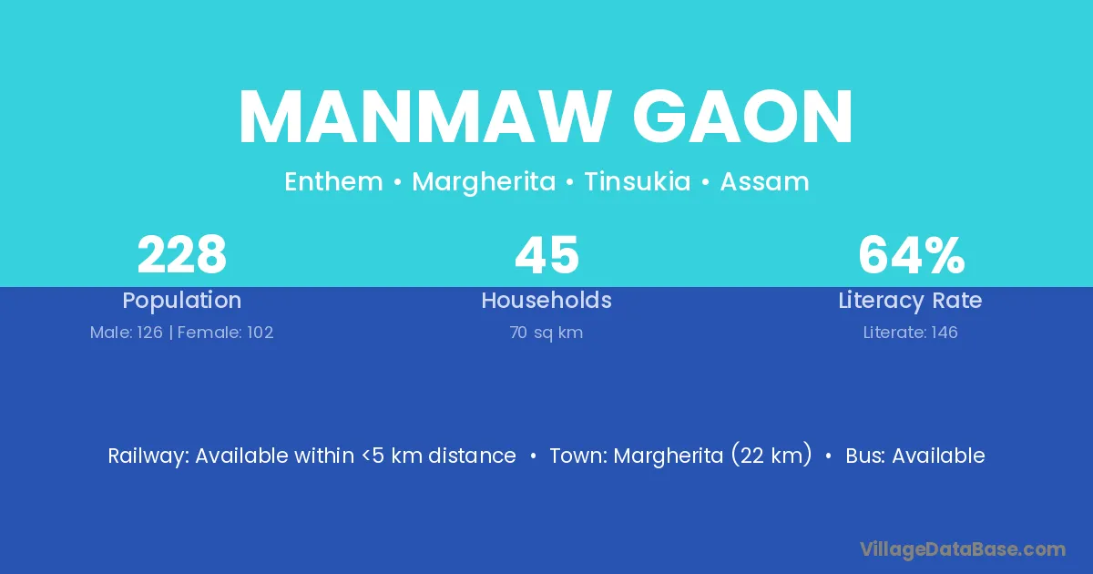 Margherita (22 km) is the nearest town to Manmaw Gaon village for major economic activities and is located approximately 22 km away.
