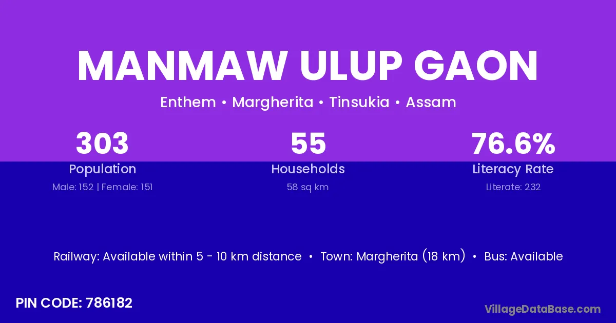 Manmaw Ulup Gaon village has a total population of 303 people, of which 152 are males and 151 are females.