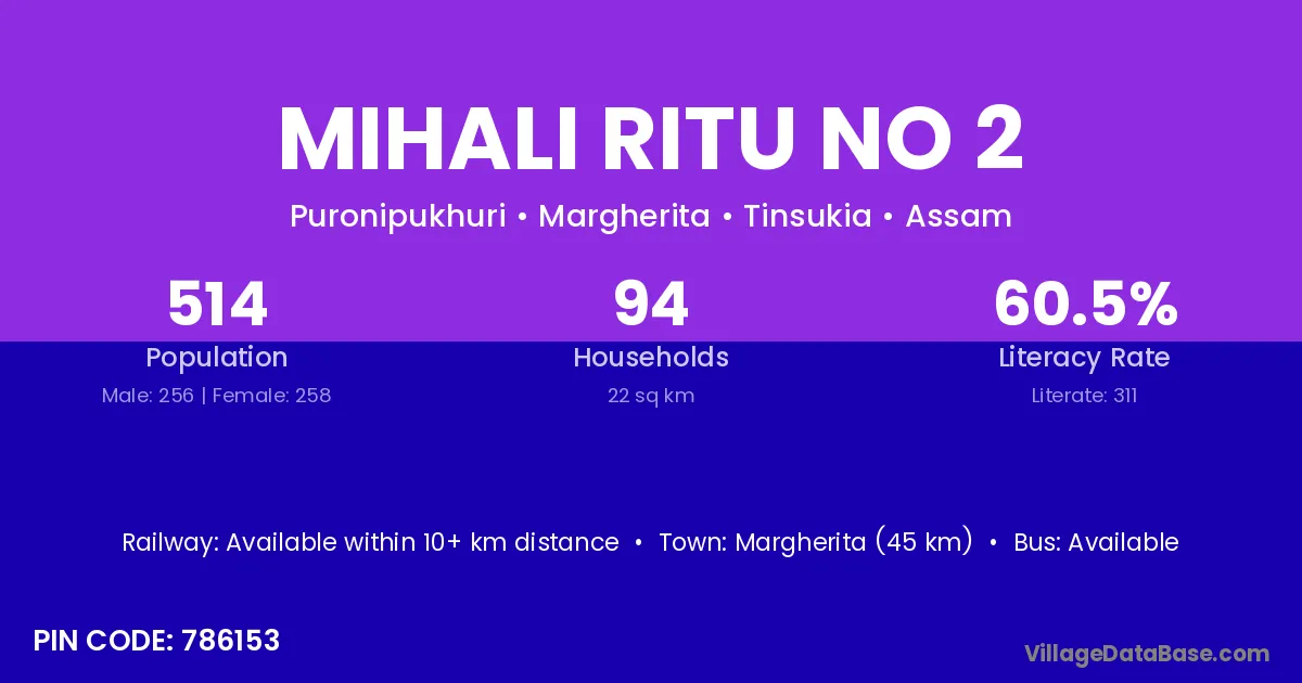 Mihali Ritu No 2 village has a total population of 514 people, of which 256 are males and 258 are females.