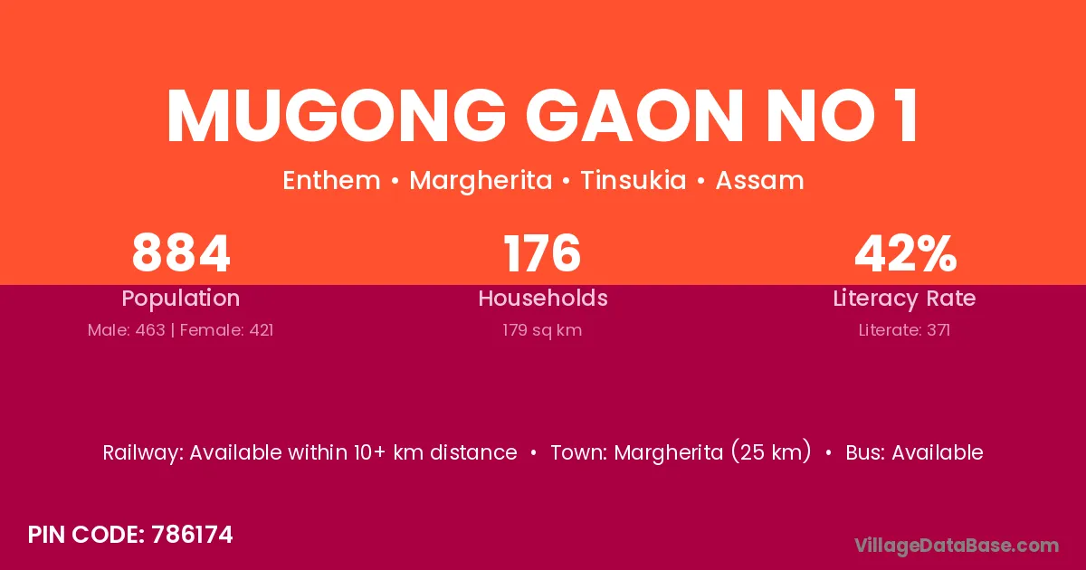 Margherita (25 km) is the nearest town to Mugong Gaon No 1 village for major economic activities and is located approximately 25 km away.