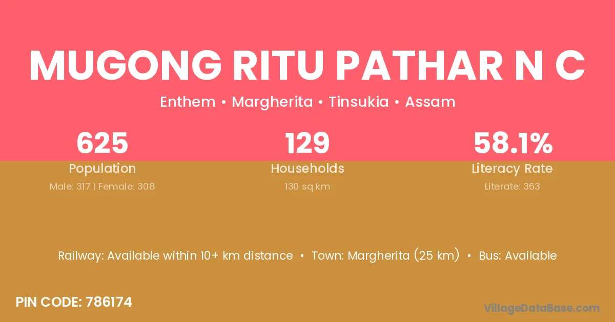 Margherita (25 km) is the nearest town to Mugong Ritu Pathar N C village for major economic activities and is located approximately 25 km away.