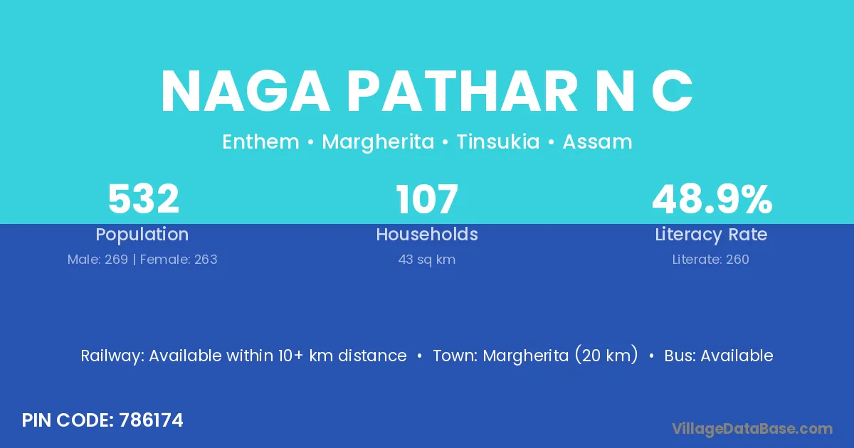 Margherita (20 km) is the nearest town to Naga Pathar N C village for major economic activities and is located approximately 20 km away.
