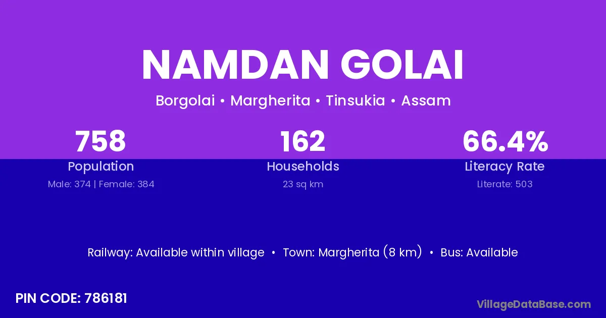 Margherita (8 km) is the nearest town to Namdan Golai village for major economic activities and is located approximately 8 km away.
