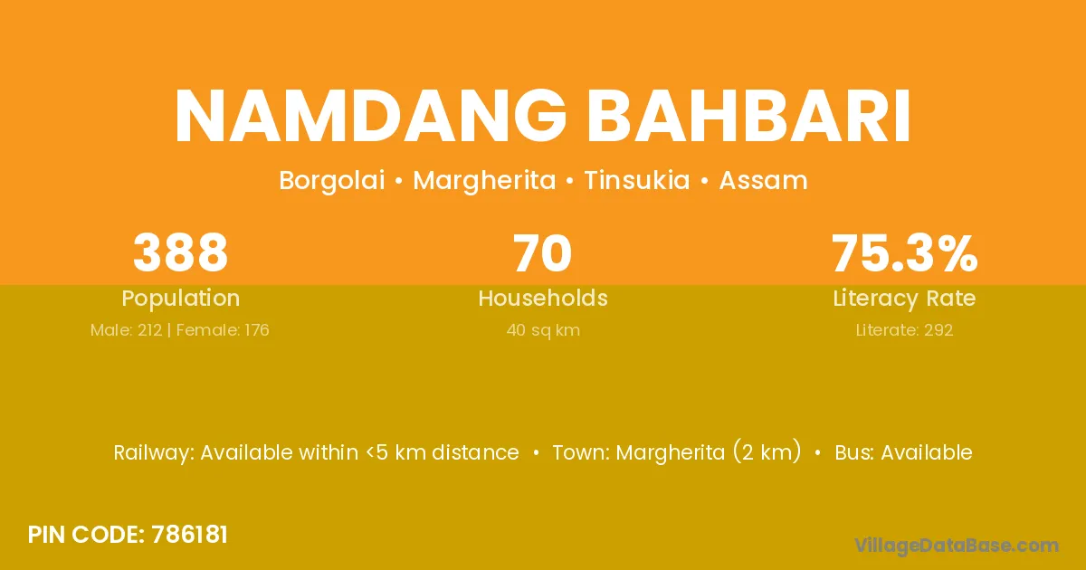 Margherita (2 km) is the nearest town to Namdang Bahbari village for major economic activities and is located approximately 2 km away.
