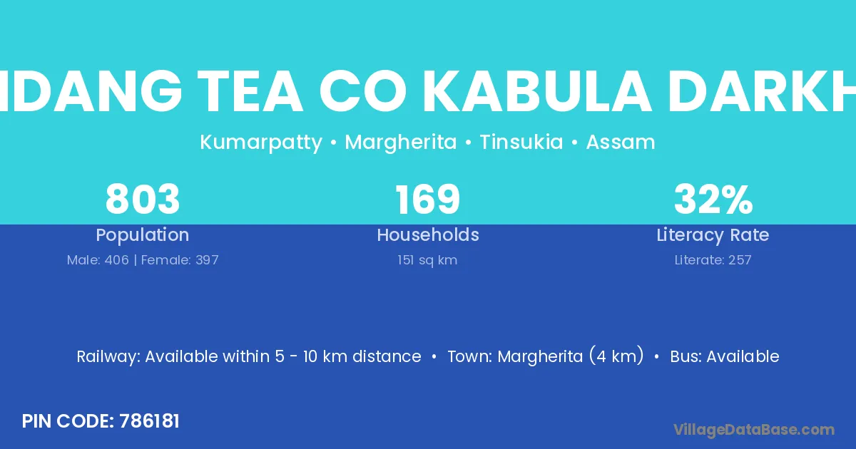 Margherita (4 km) is the nearest town to Namdang Tea Co Kabula Darkhast village for major economic activities and is located approximately 4 km away.