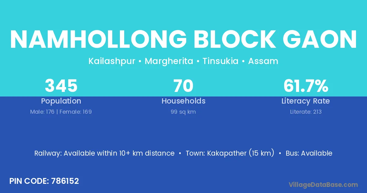 Namhollong Block Gaon village has a total population of 345 people, of which 176 are males and 169 are females.