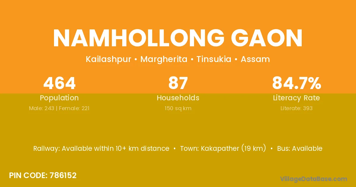 Kakapather (19 km) is the nearest town to Namhollong Gaon village for major economic activities and is located approximately 19 km away.