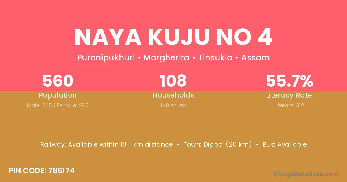 Digboi (20 km) is the nearest town to Naya Kuju No 4 village for major economic activities and is located approximately 20 km away.
