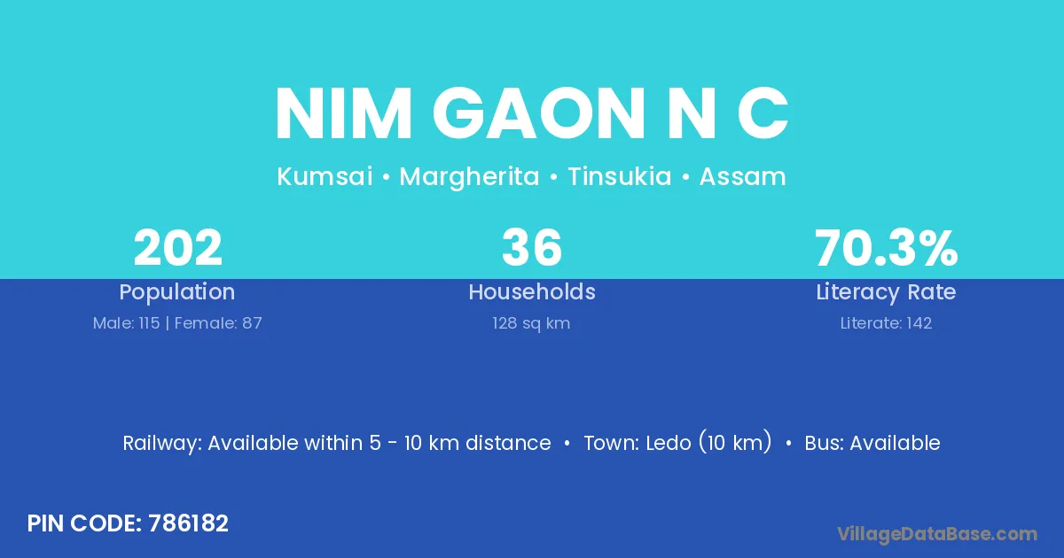 Nim Gaon N C village has a total population of 202 people, of which 115 are males and 87 are females.