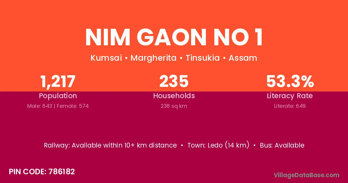 Nim Gaon No 1 village has a total population of 1,217 people, of which 643 are males and 574 are females.