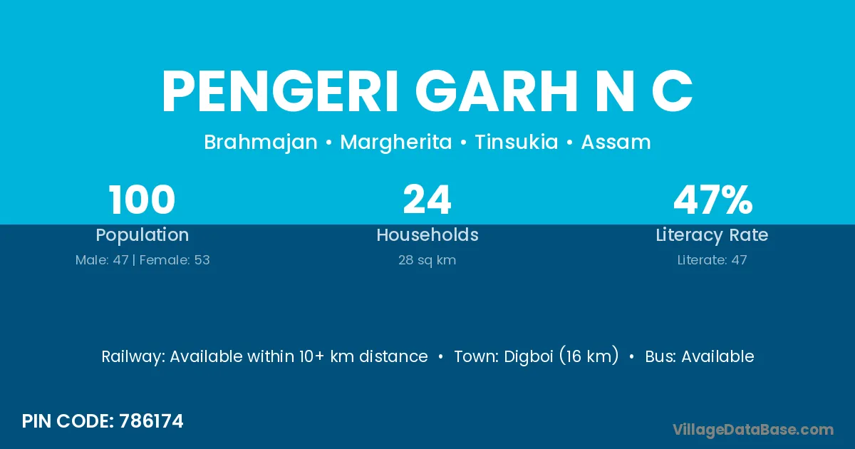 Digboi (16 km) is the nearest town to Pengeri Garh N C village for major economic activities and is located approximately 16 km away.