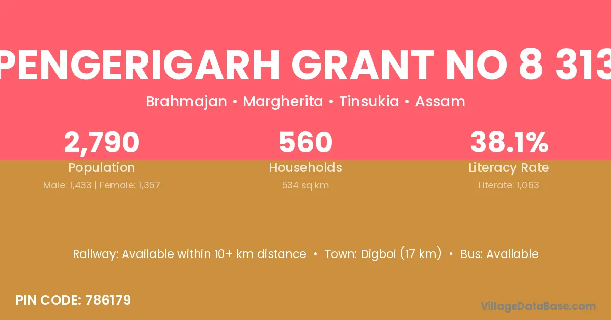 Digboi (17 km) is the nearest town to Pengerigarh Grant No 8 313 village for major economic activities and is located approximately 17 km away.