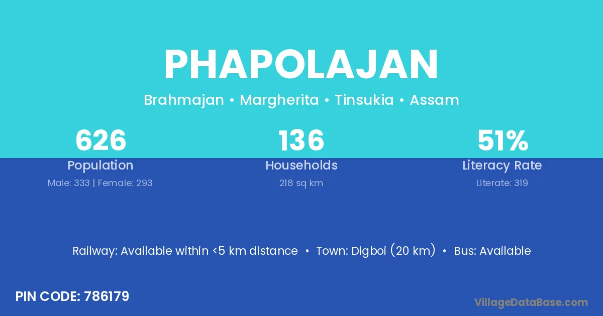 Digboi (20 km) is the nearest town to Phapolajan village for major economic activities and is located approximately 20 km away.