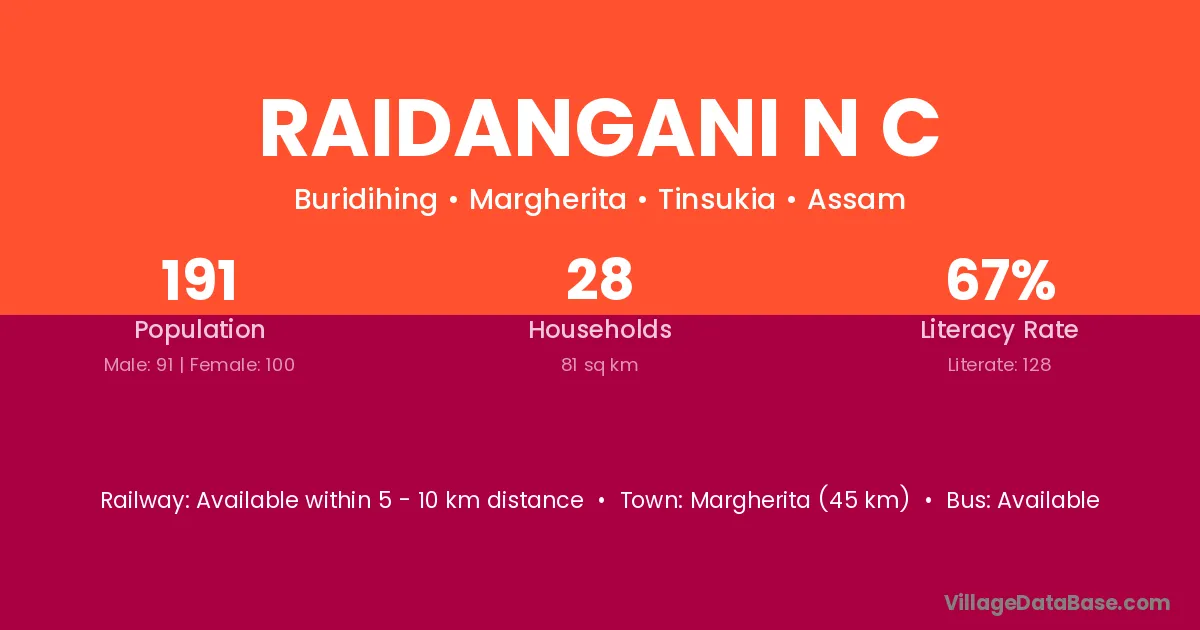 Margherita (45 km) is the nearest town to Raidangani N C village for major economic activities and is located approximately 45 km away.