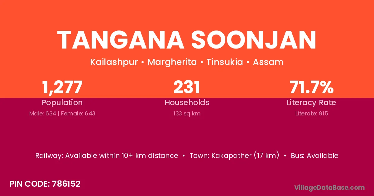 Tangana Soonjan village is located in the Margherita Subdivision of the Tinsukia district in Assam .