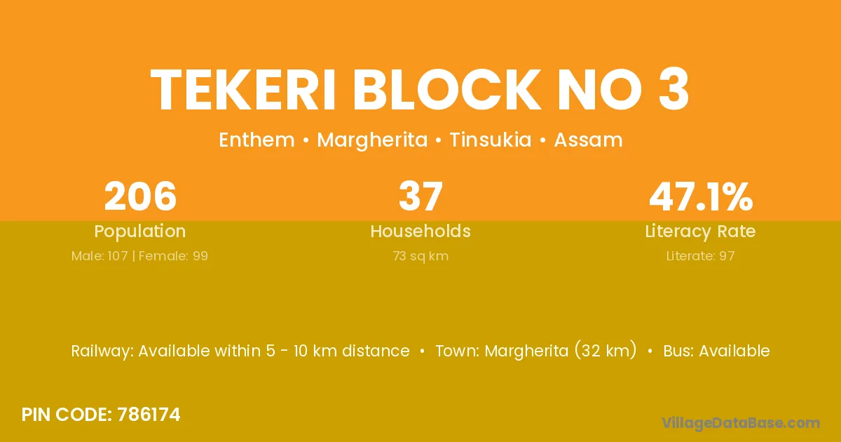Margherita (32 km) is the nearest town to Tekeri Block No 3 village for major economic activities and is located approximately 32 km away.