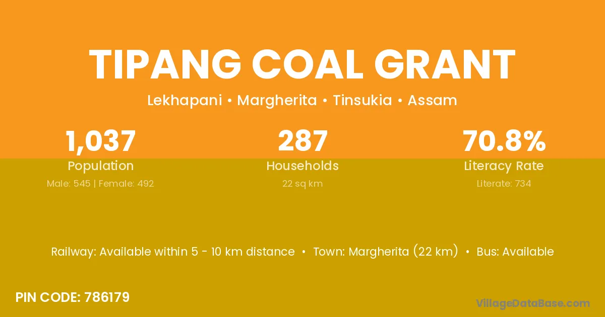 Margherita (22 km) is the nearest town to Tipang Coal Grant village for major economic activities and is located approximately 22 km away.