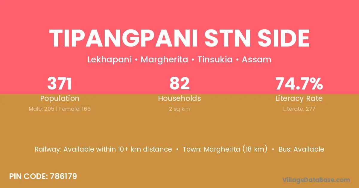 Margherita (18 km) is the nearest town to Tipangpani Stn Side village for major economic activities and is located approximately 18 km away.