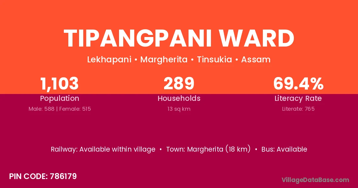 Margherita (18 km) is the nearest town to Tipangpani Ward village for major economic activities and is located approximately 18 km away.