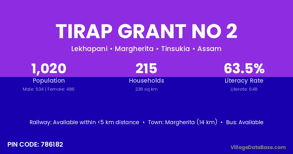 Margherita (14 km) is the nearest town to Tirap Grant No 2 village for major economic activities and is located approximately 14 km away.