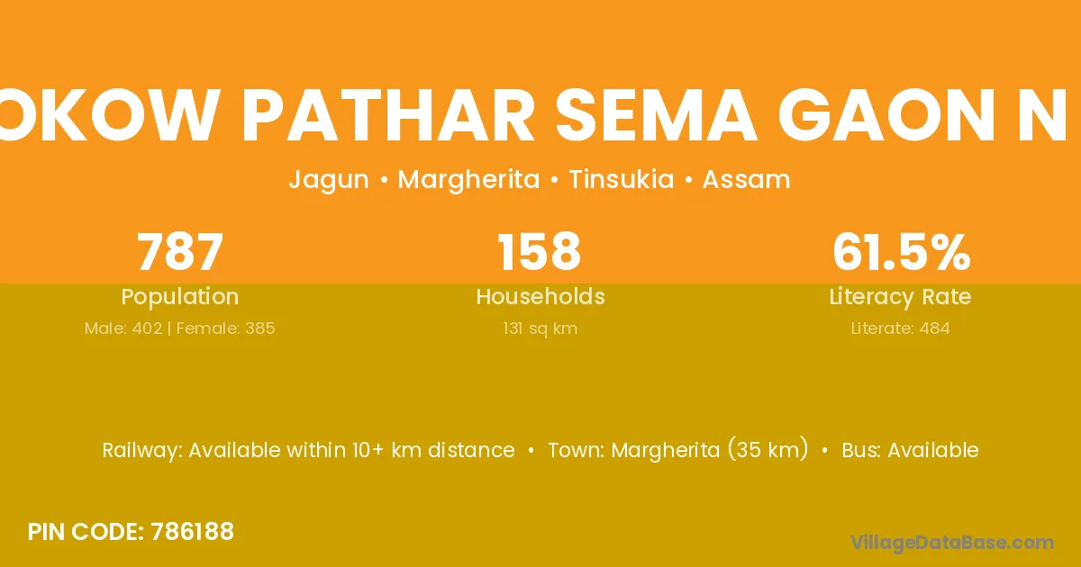 Tokow Pathar Sema Gaon N C village has a total population of 787 people, of which 402 are males and 385 are females.