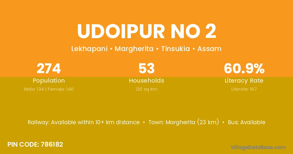 Margherita (23 km) is the nearest town to Udoipur No 2 village for major economic activities and is located approximately 23 km away.