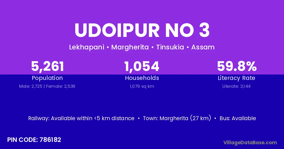 Margherita (27 km) is the nearest town to Udoipur No 3 village for major economic activities and is located approximately 27 km away.
