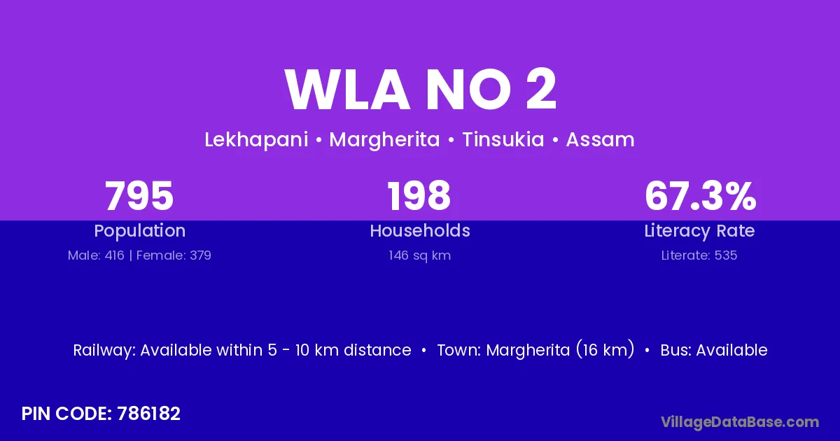 Margherita (16 km) is the nearest town to Wla No 2 village for major economic activities and is located approximately 16 km away.