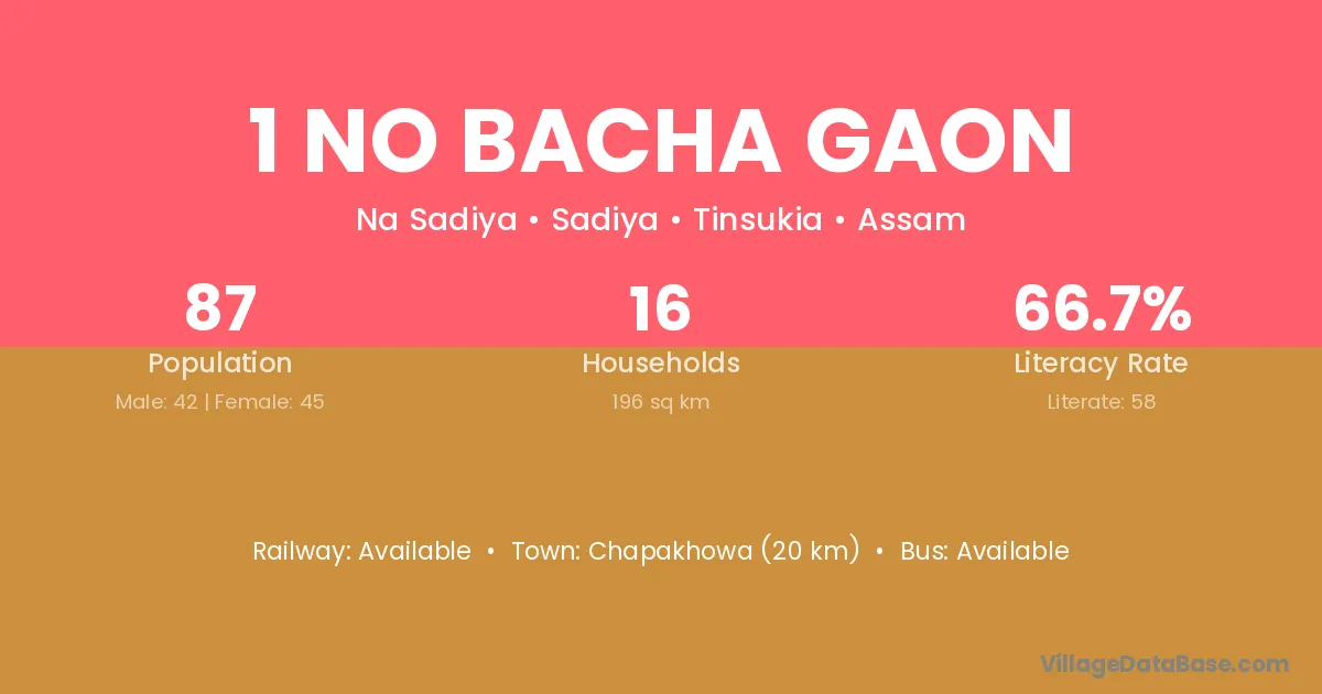 1 No Bacha Gaon village has a total population of 87 people, of which 42 are males and 45 are females.