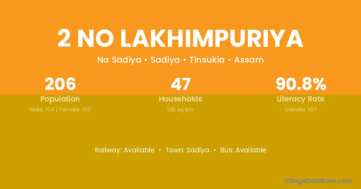 2 No Lakhimpuriya village has a total population of 206 people, of which 104 are males and 102 are females.