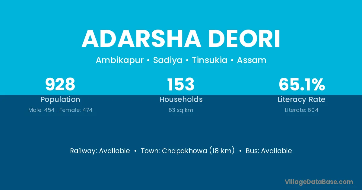 Chapakhowa (18 km) is the nearest town to Adarsha Deori village for major economic activities and is located approximately 18 km away.