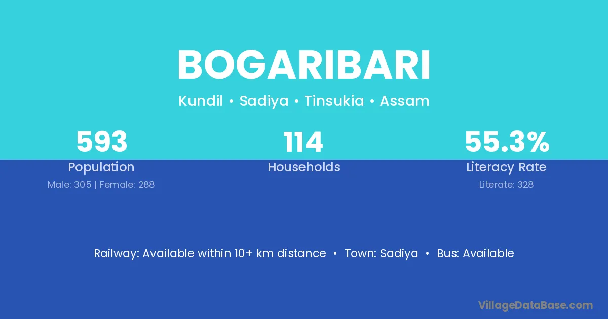 Bogaribari village has a total population of 593 people, of which 305 are males and 288 are females.
