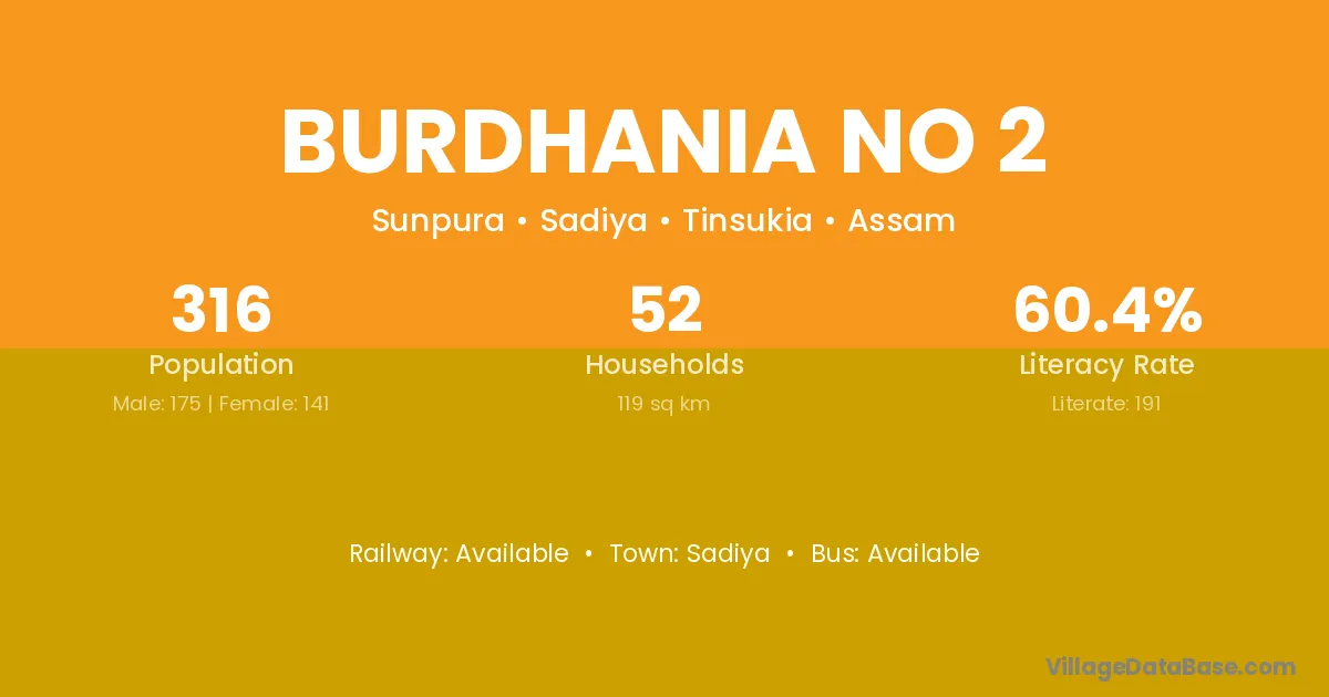 Burdhania No 2 village is located in the Sadiya Subdivision of the Tinsukia district in Assam .