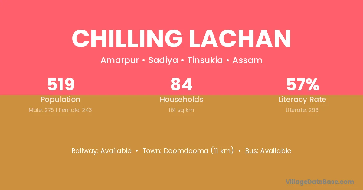 Doomdooma (11 km) is the nearest town to Chilling Lachan village for major economic activities and is located approximately 11 km away.