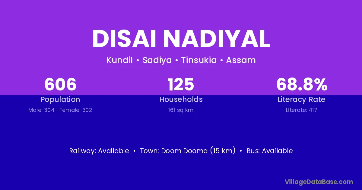 Doom Dooma (15 km) is the nearest town to Disai Nadiyal village for major economic activities and is located approximately 15 km away.