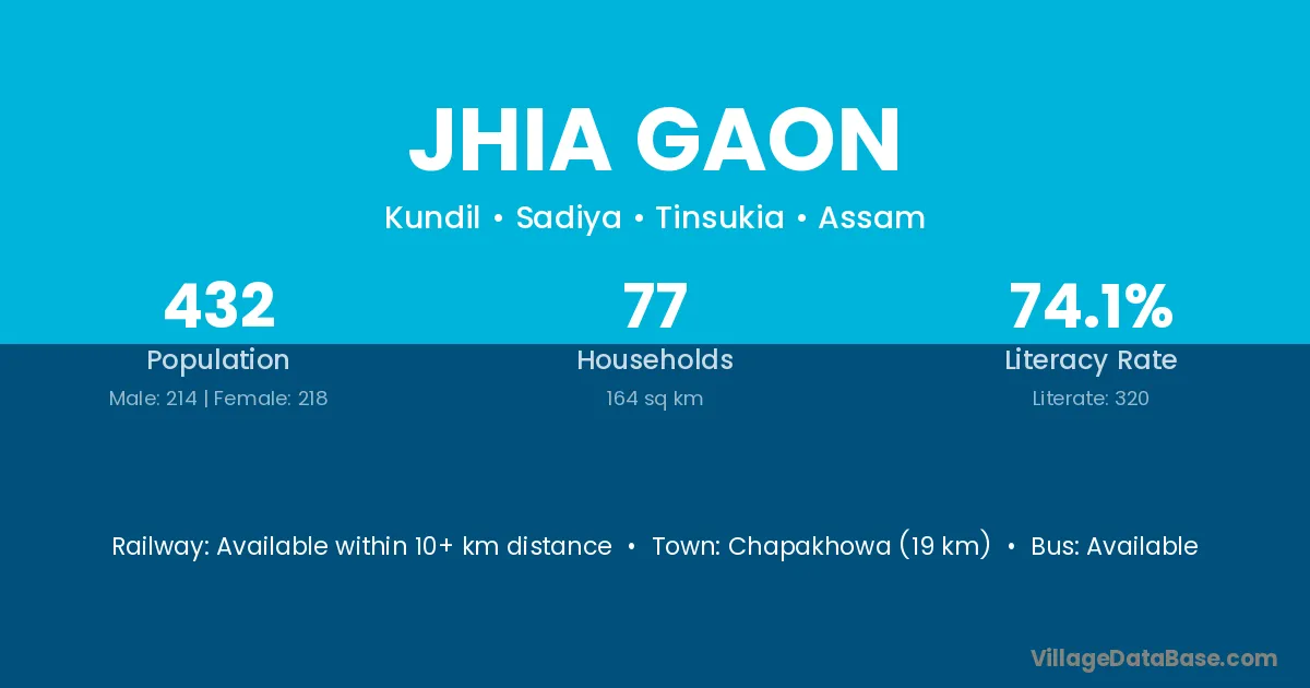 Jhia Gaon village has a total population of 432 people, of which 214 are males and 218 are females.