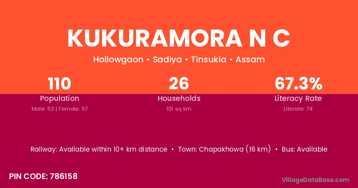 Chapakhowa (16 km) is the nearest town to Kukuramora N C village for major economic activities and is located approximately 16 km away.