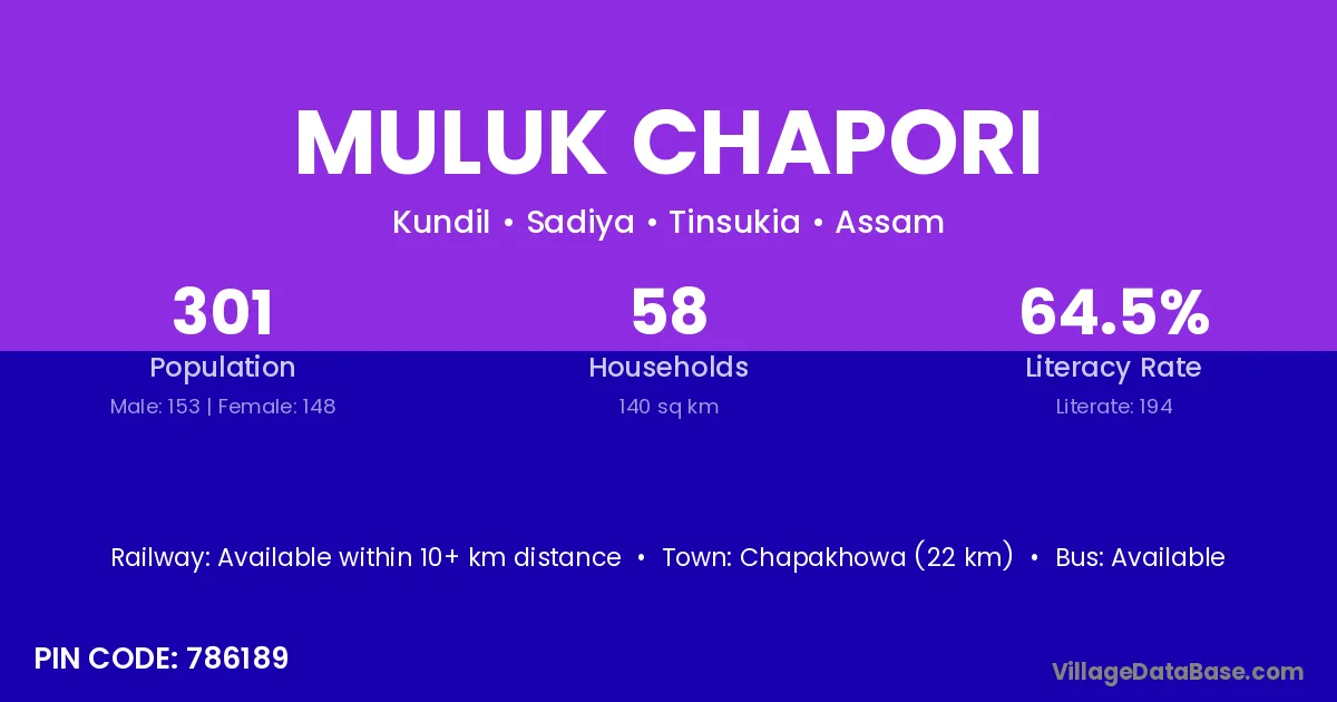 Chapakhowa (22 km) is the nearest town to Muluk Chapori village for major economic activities and is located approximately 22 km away.