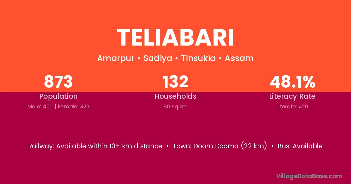 Doom Dooma (22 km) is the nearest town to Teliabari village for major economic activities and is located approximately 22 km away.