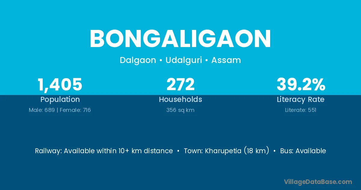 Kharupetia (18 km) is the nearest town to Bongaligaon village for major economic activities and is located approximately 18 km away.
