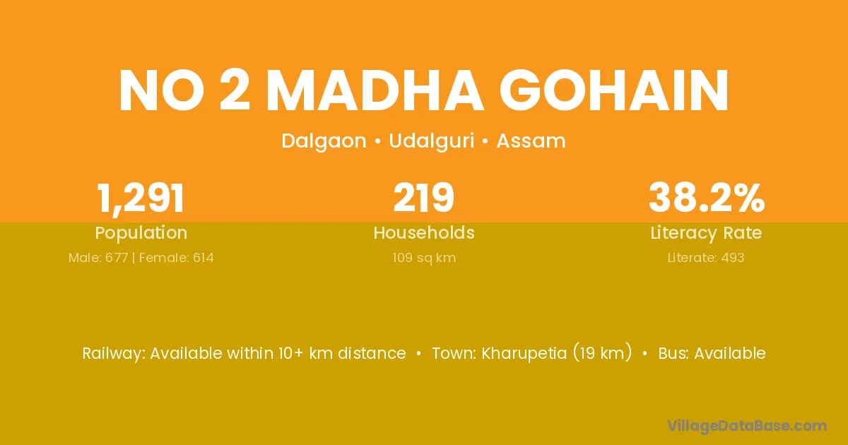 Kharupetia (19 km) is the nearest town to No 2 Madha Gohain village for major economic activities and is located approximately 19 km away.
