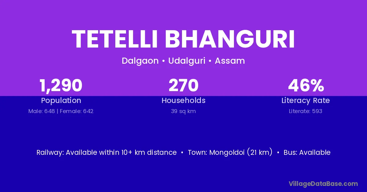 Mongoldoi (21 km) is the nearest town to Tetelli Bhanguri village for major economic activities and is located approximately 21 km away.