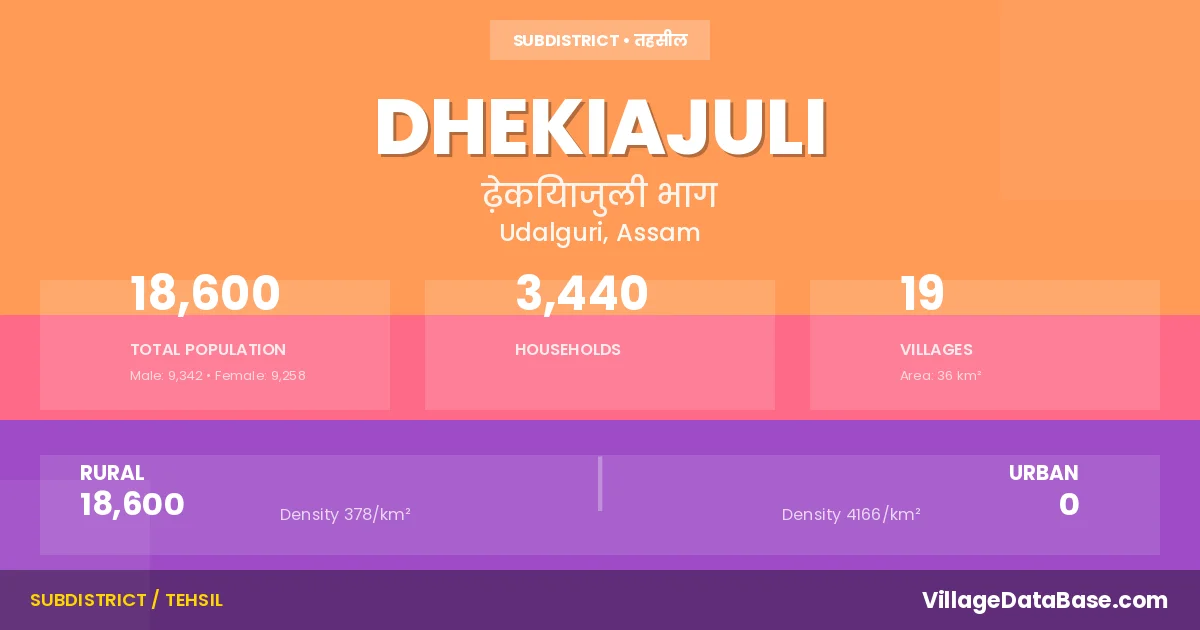 According to the 2011 census The total area of Dhekiajuli Subdivision is 36 km², with a population of 18600 people. The population density is 394 inhabitants per square kilometre, and there are approximately 3440 houses in the sub district.