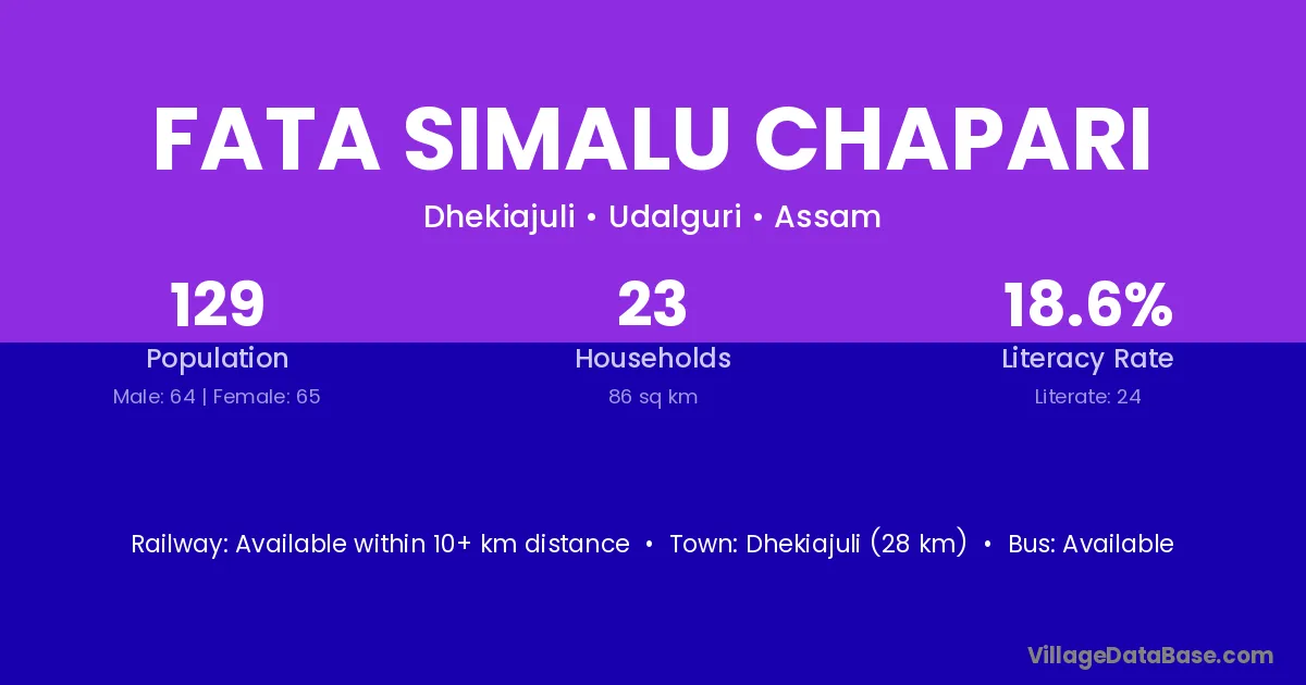 Dhekiajuli (28 km) is the nearest town to Fata Simalu Chapari village for major economic activities and is located approximately 28 km away.